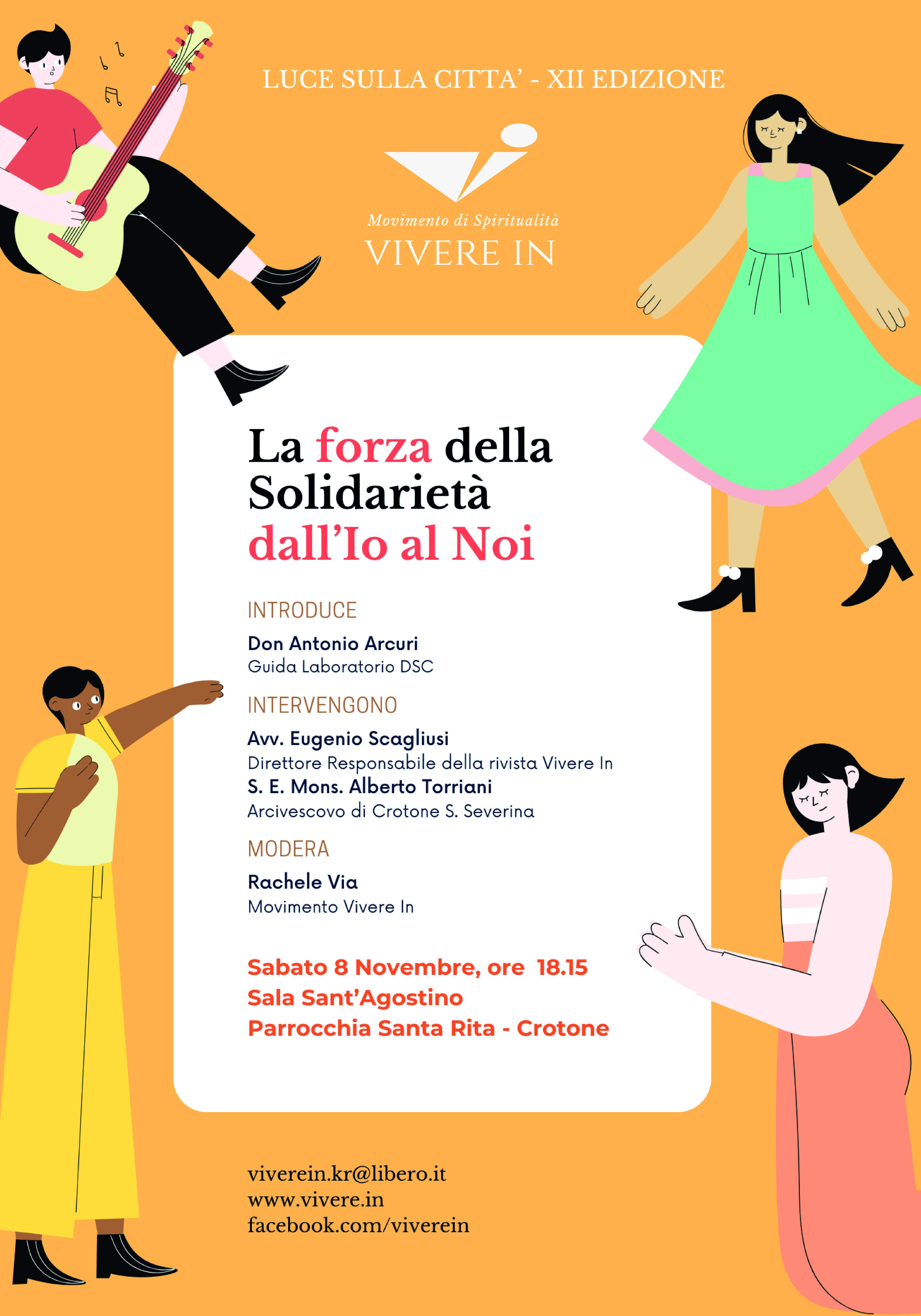 L’incontro, che vedrà il contributo di S.E. Mons. Alberto Torriani, Arcivescovo di Crotone Santa Severina, e dell’Avv. Eugenio Scagliusi, direttore responsabile della rivista Vivere In, vuole essere un’occasione per valorizzare la solidarietà come aspetto qualificante dell’umano vivere ed agire, alla luce del magistero della Chiesa.
