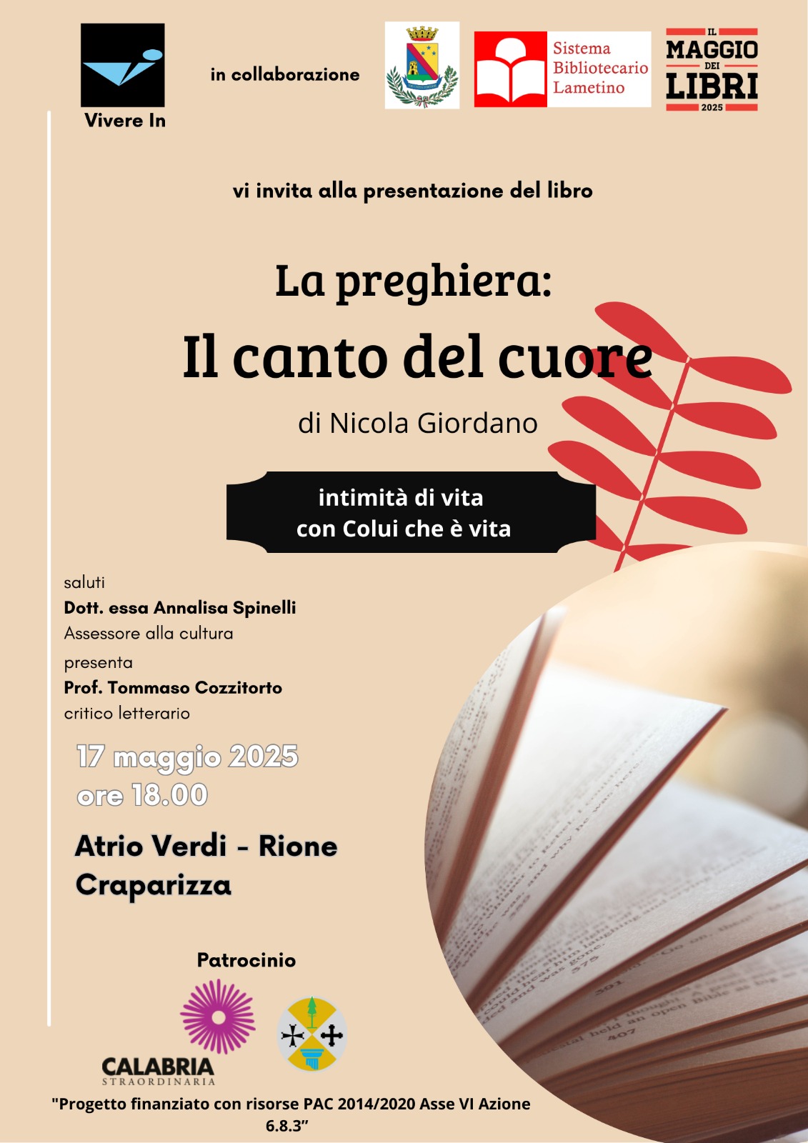L’Associazione Vivere In ha organizzato per sabato 17 maggio alle ore 18.00 presso l’Atrio Verdi, nel quartiere della Craparizza a Lamezia Terme, all’interno della rassegna Intelleg(g)o”….del maggio dei libri lametino la presentazione del libro: “La preghiera: il canto del cuore” di Nicola Giordano edizioni Vivere In.